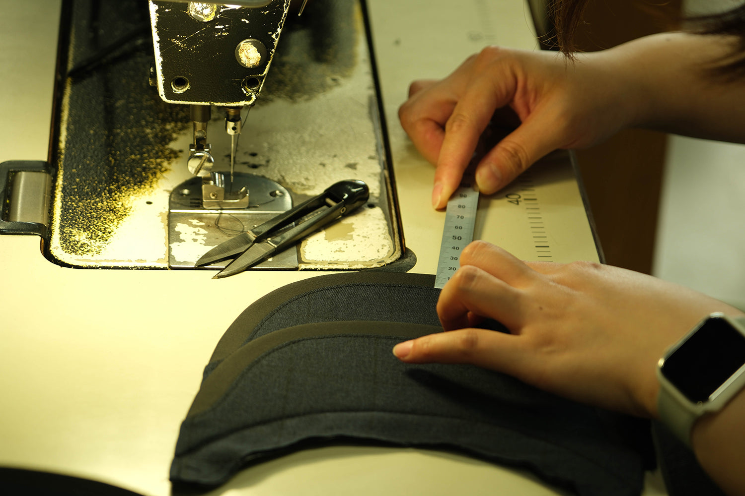 作成したパターンを使って生地を裁断し、縫製してプロトタイプを制作します。これは最終的なパターンを完成させるための試作品です。縫い上がった試作品はお客様にご確認いただき、必要に応じてさらにパターンや仕様を変更します。この工程を1~2回繰り返し、ご希望の型に近づけていきます。